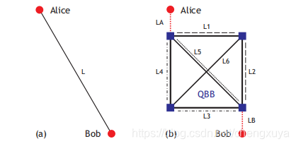 Fig. 1. (Color online). Alice and Bob want to share a secret key. (a) Point-to point QKD-Link L: A typical solution nowadays. (b) Quantum network: The QKD-Links LA and LB are used to access the QBB, the nodes of the QBB being represented by squares (in blue) and the corresponding QKD-Links being denoted by L1 through L6. All QKD-Links provide unconditionally secure channels. An end-to-end secure channel from Alice to Bob along the paths LA-L5-LB, LA-L1-L2-LB and LA-L3-L4-LB allows secure transmission of a secret key。