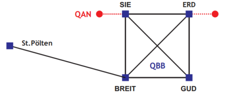 为了介绍和演示证明新的网络功能并展示证明单链路的各种优势,我们在维也纳的四个站(SIE,ERD,GUD,BREIT)中实现了一个通用的矩形构建块(图2)并通过在附近的城市St.P¨olten的一个节点进行扩展。 实现了所有QBB链路,包括两条对角线和两条针对最终用户的短QKD连接。