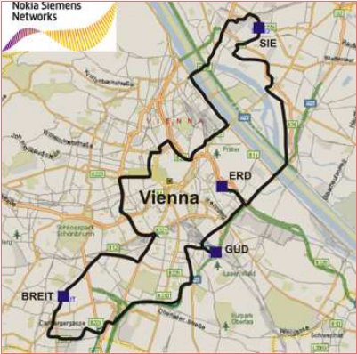 所有链接都将在典型的环形网络上运行,以连接西门子奥地利的办公楼。 图显示了周长约为63 km的光纤环。 我们使用四个节点站分布在整个维也纳市,一个位于St. Poelten,这是另一个由85公里长的光纤连接的城市。 两个交叉连接的光纤也物理地部署在环中(分别连接两对非相邻节点).