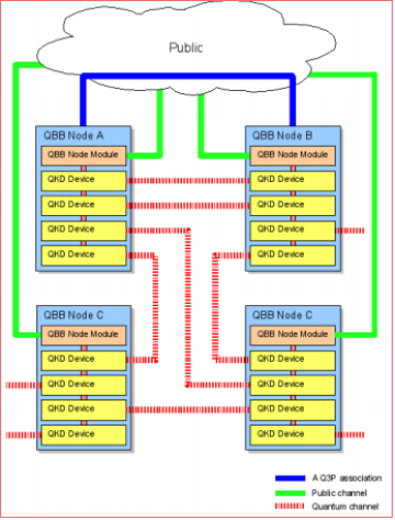 标准化计划和专门致力于优化单光子探测(QKD的主要技术挑战,导致成本高昂)是该项目的一部分。 然而,主要目标是开始运营和测试一个综合密钥分布网络,该网络被设计为量子背骨网络(QBB),用于在维也纳市进行测试。 因此,不同SECOQC合作伙伴的异质QKD系统与节点模块连接,这超过了网络功能。 部署在典型的电信城域网(MAN)上的QBB是证明完全网络化多点到多点量子密钥分发的可行性的重要一步。 针对具有分布式设施的组织(如政府机构,公司和银行),提出了网络安全通信解决方案的目标市场。