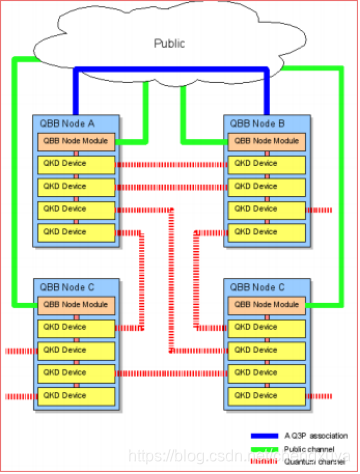 Fig. 5. (Color online). Four nodes of the QBB are connected with quantum channels and communicate over the public channels. Between nodes A and B, one specific connection is highlighted to emphasize the communication of the Q3P network protocol.