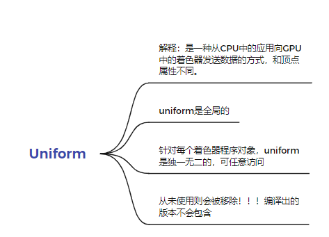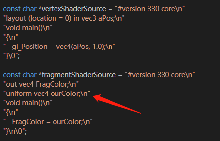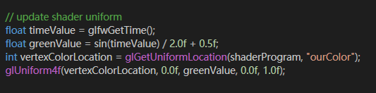 在片段着色器中声明了一个ourColor的uniform变量,并赋值给输出变量FragColor。然后通过找到uniform属性的索引,再对它赋值更新。