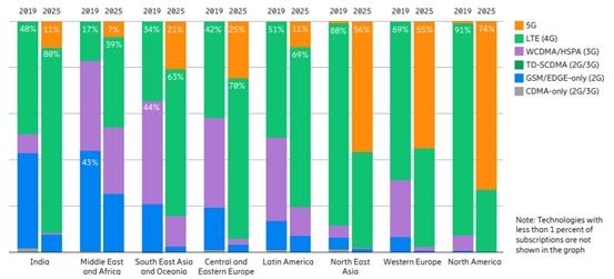 爱立信称,到2025年,最低的5G普及率将来自中东和非洲(7%),拉丁美洲(11%)和印度(11%)。但是,预计印度的LTE数量将从2019年的48%增长到2025年的80%。这意味着该国将在2025年之前将其大部分2G和3G连接替换为4G用户。同时,5G服务预计将于2022年在印度上市。