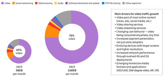 据爱立信预测,到2025年,移动网络中的视频流量将继续以每年30%的速度增长。视频流量以每月38艾字节的速度增长,占63%,社交媒体流量仅占10%。到2025年,视频流量将以每月160艾字节的速度增至76%。
