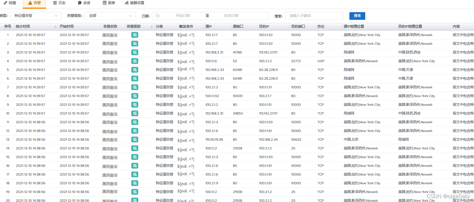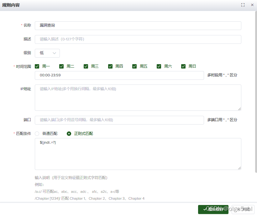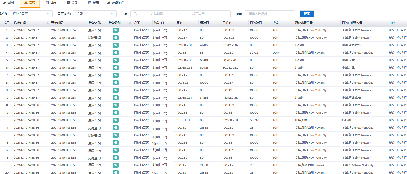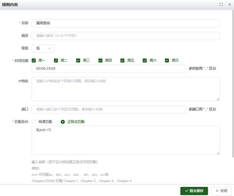 · 匹配内容:匹配任意端口包含${jndi:[攻击指令]}的内容