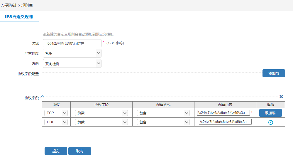 如果无法及时更新规则库,也可以使用自定义规则。路径为:入侵防御→规则库→自定义规则,新建IPS自定义规则:\x24\x7b\x6a\x6e\x64\x69\x3a 。