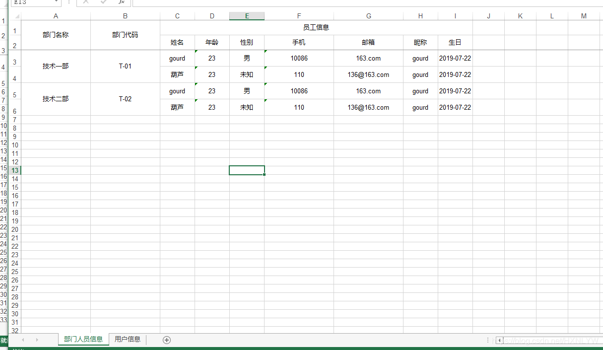 public class DeptExcel implements Serializable {/*** 部门代码*/@Excel(name = "部门代码", orderNum = "2", width = 20, needMerge = true)private String code;/*** 部门名称*/@Excel(name = "部门名称", orderNum = "1", width = 20, needMerge = true)private String name;@ExcelCollection(name = "员工信息", orderNum = "3")private List users;}