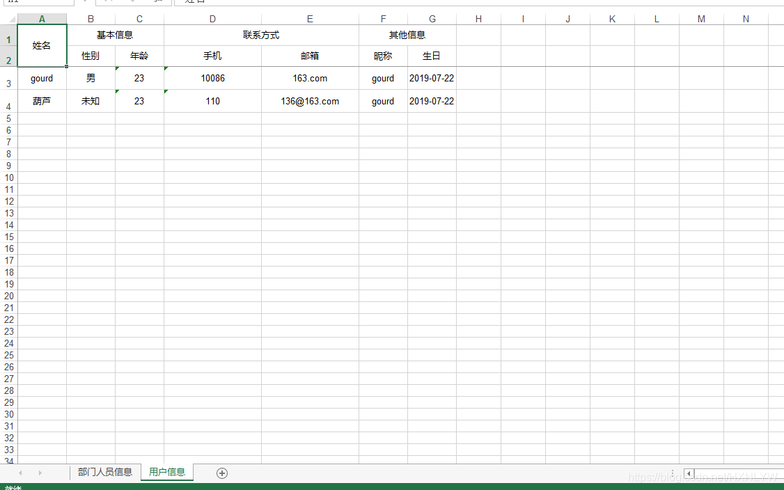 public class UserExcel implements Serializable {/*** 名称*/@Excel(name = "姓名",orderNum = "1")private String name;/*** 年龄*/@Excel(name = "年龄",orderNum = "2",groupName = "基本信息")private Integer age;/*** 性别*/@Excel(name = "性别",orderNum = "2",replace = {"男_M", "女_F","未知_X"},groupName = "基本信息")private String sex;/*** 手机*/@Excel(name = "手机",orderNum = "3",width = 20,groupName = "联系方式")private String mobilePhone;/*** 邮箱*/@Excel(name = "邮箱",orderNum = "4",width = 20,groupName = "联系方式", isWrap=true)private String email;/*** 昵称*/@Excel(name = "昵称",orderNum = "5",groupName = "其他信息")private String nickName;@Excel(name = "生日", exportFormat = "yyyy-MM-dd", orderNum = "6",groupName = "其他信息")private Date birth;