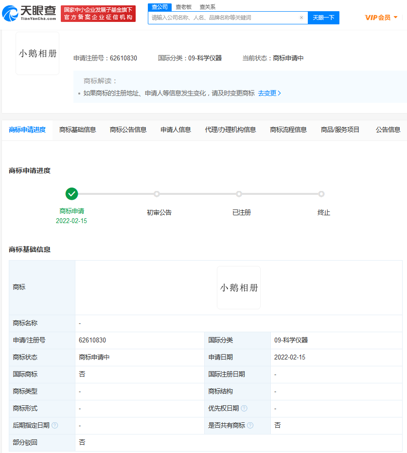 2022-02-21,据了解,近日,腾讯科技(深圳)有限公司申请注册“小鹅相册”商标,国际分类为科学仪器等,当前商标状态为申请中。此前,该公司已成功注册“小Q相册”“腾讯相册管家”“家庭相册”等商标。