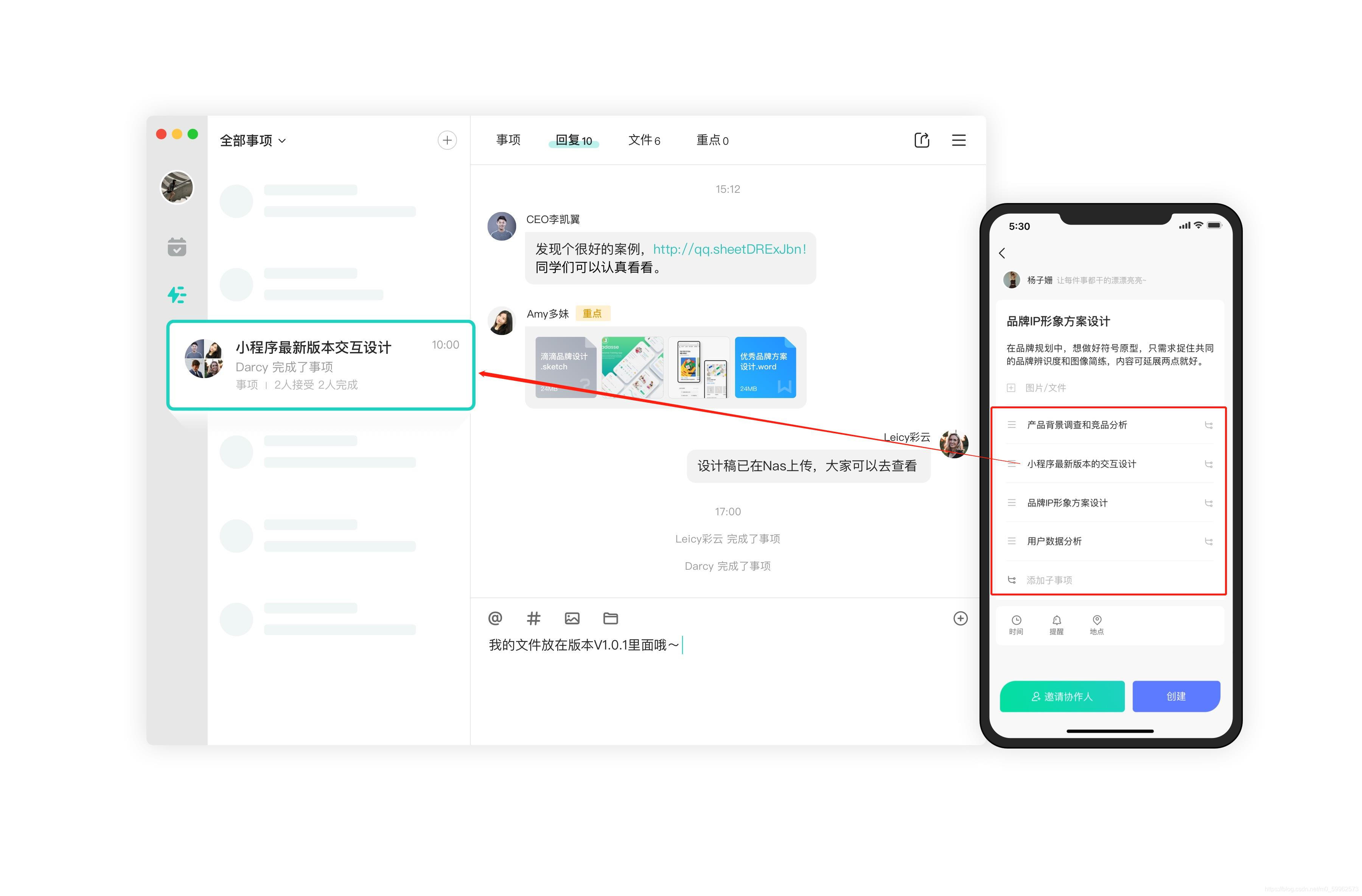 所派发的事项,会以卡片的形式发送到执行者的微信聊天窗口,即时实现事项的同步协作。
