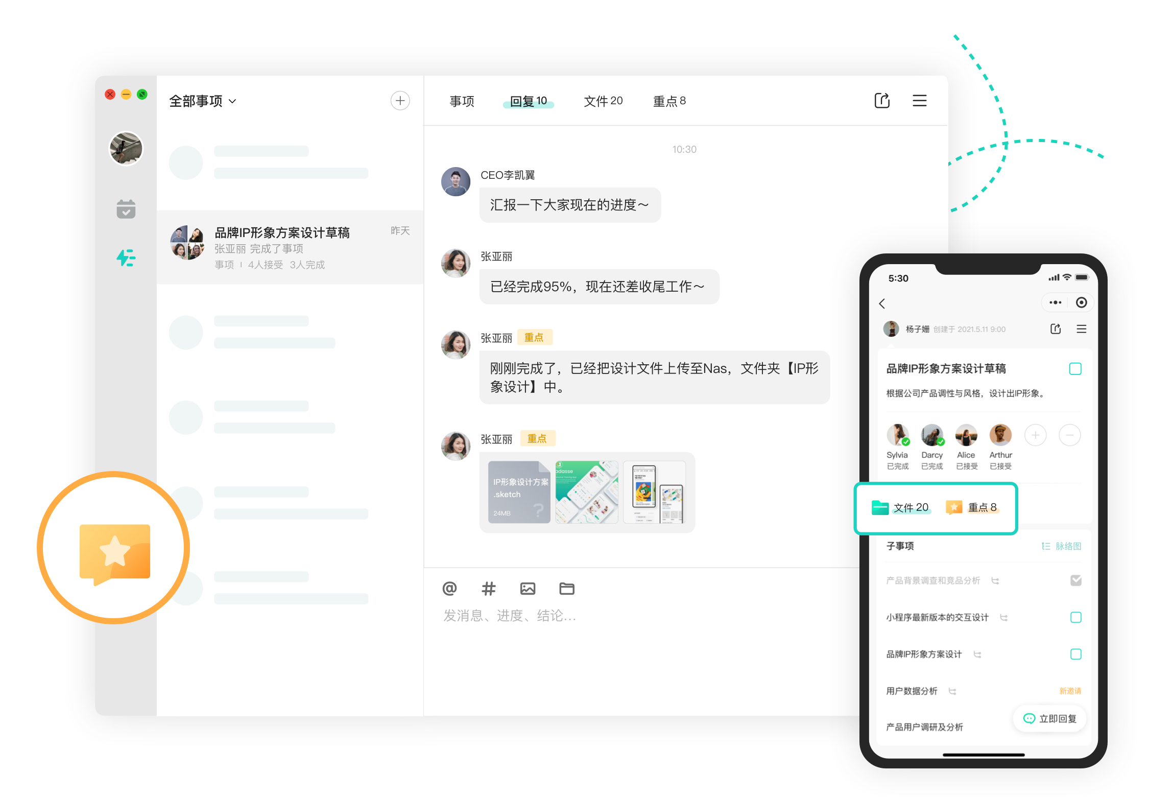 沟通过程中,我们可以对沟通内容的文字、文件等标记重点,且飞项对“重点”、“文件”会自动提炼,再也不用“爬楼”找干货,即便是新邀小伙伴也能快速了解事项的重点内容,省时又高效。