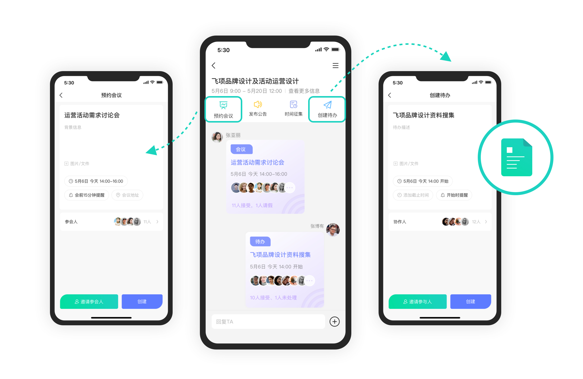 协作过程中,为了推动事项的进展,难免需要开个会议讨论,而会议结束后,也会产生相应的待办事项,以及发布即时公告等等。