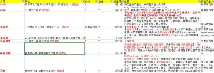 这里推荐一个方法,表格记录法,把每一次的投递记录,面试记录,面试经验都按顺序的记录在表格中,进行针对性的安排,到目前为止,我投递了哪些公司?哪些公司简历没过?哪些公司开始面试和笔试?