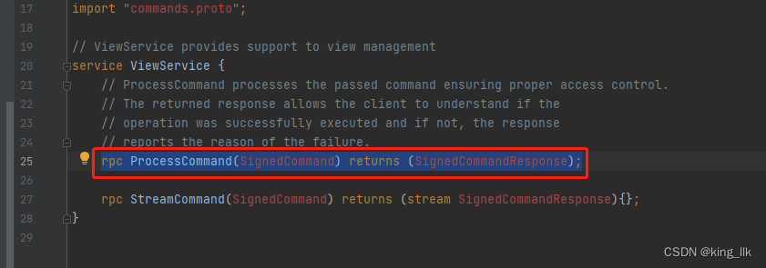 service ViewService {// ProcessCommand processes the passed command ensuring proper access control.// The returned response allows the client to understand if the// operation was successfully executed and if not, the response// reports the reason of the failure.rpc ProcessCommand(SignedCommand) returns (SignedCommandResponse);rpc StreamCommand(SignedCommand) returns (stream SignedCommandResponse){};