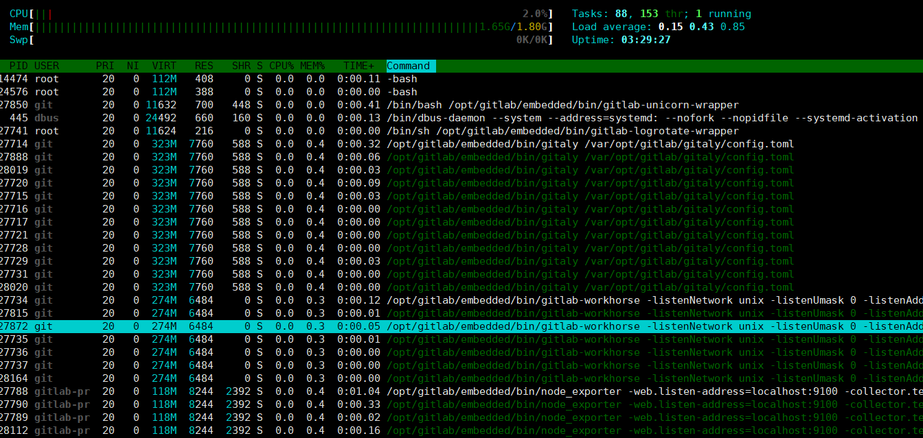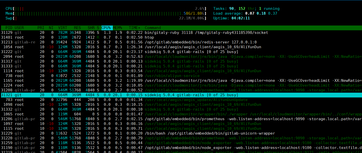 但是最大的问题就是内存爆满,用命令看看free -h,或者用htop看看,我相信大部分人都跟我一样,物理内存爆满