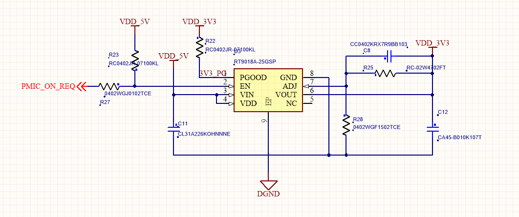 这个引脚是检测输出的电压是否达到设定值的90%,如果达到设定的电压值90%以上,这个引脚输出高电平,也就是说上这个芯片供电电压有没有稳定输出,稳定之后这个PGOOD引脚输出高电平,我们可以通过检测这个引脚来判断给核心板供电是否达到稳定,因为核心板启动过程中,电压是不稳定的。稳定之后,说明核心板已经启动结束,此时再延迟300ms再给其他外设供电3.3V。