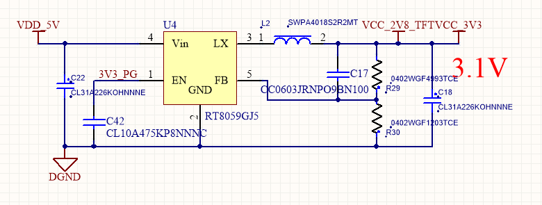 电路很简单,需要注意的是C42这颗电容,我们就是利用这个电容实现了延迟500ms之后,使能DCDC向外输出3.3V电压。
