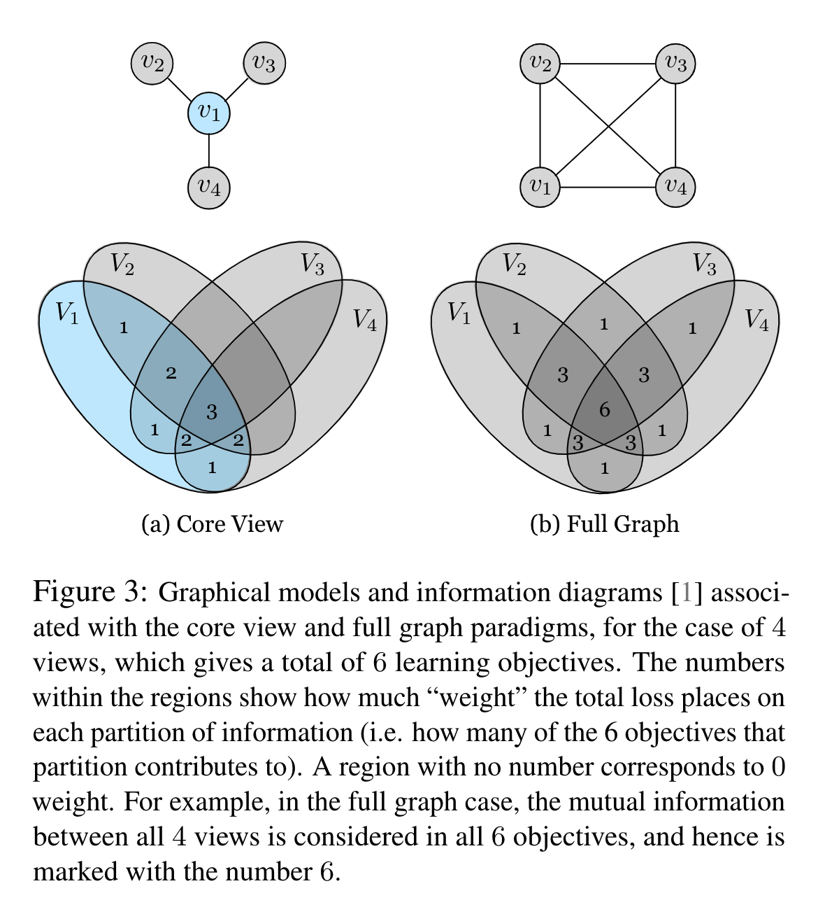 不难看出,全图公式的计算成本与视图数量的组合数成正比,并且远高于核心视图,但是全图公式能够捕获不同视图之间的更多信息,这可能对下游任务是有用的。 另外全图公式还可以自然地处理缺失的信息。