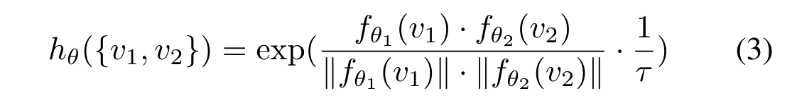 hθ(·) 由神经网络实现,并使用了两个编码器fθ1(·)和fθ2(·),分别具有参数θ1和θ2, 将两个编码器提取结果的余弦相似度计算为分数,并通过超参数τ调整其动态范围: