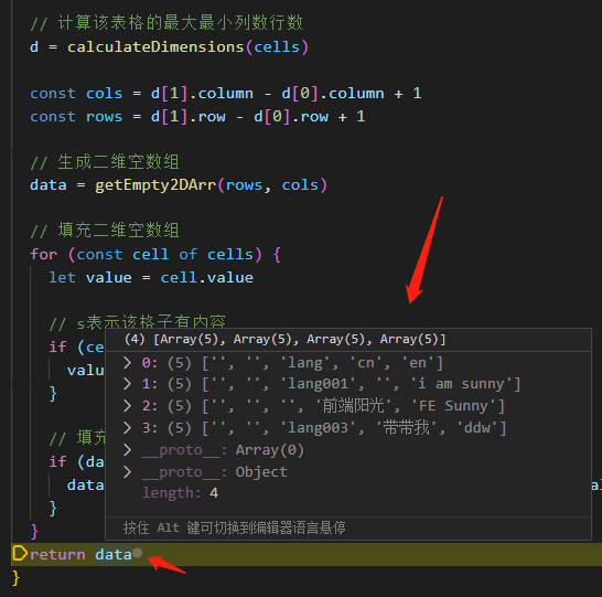 // 计算该表格的最大最小列数行数d = calculateDimensions(cells)const cols = d[1].column - d[0].column + 1const rows = d[1].row - d[0].row + 1// 生成二维空数组data = getEmpty2DArr(rows, cols)// 填充二维空数组for (const cell of cells) {let value = cell.value// s表示该格子有内容if (cell.type == 's') {value = values[parseInt(value)]}// 填充该格子if (data[cell.row - d[0].row]) {data[cell.row - d[0].row][cell.column - d[0].column] = value}}return data