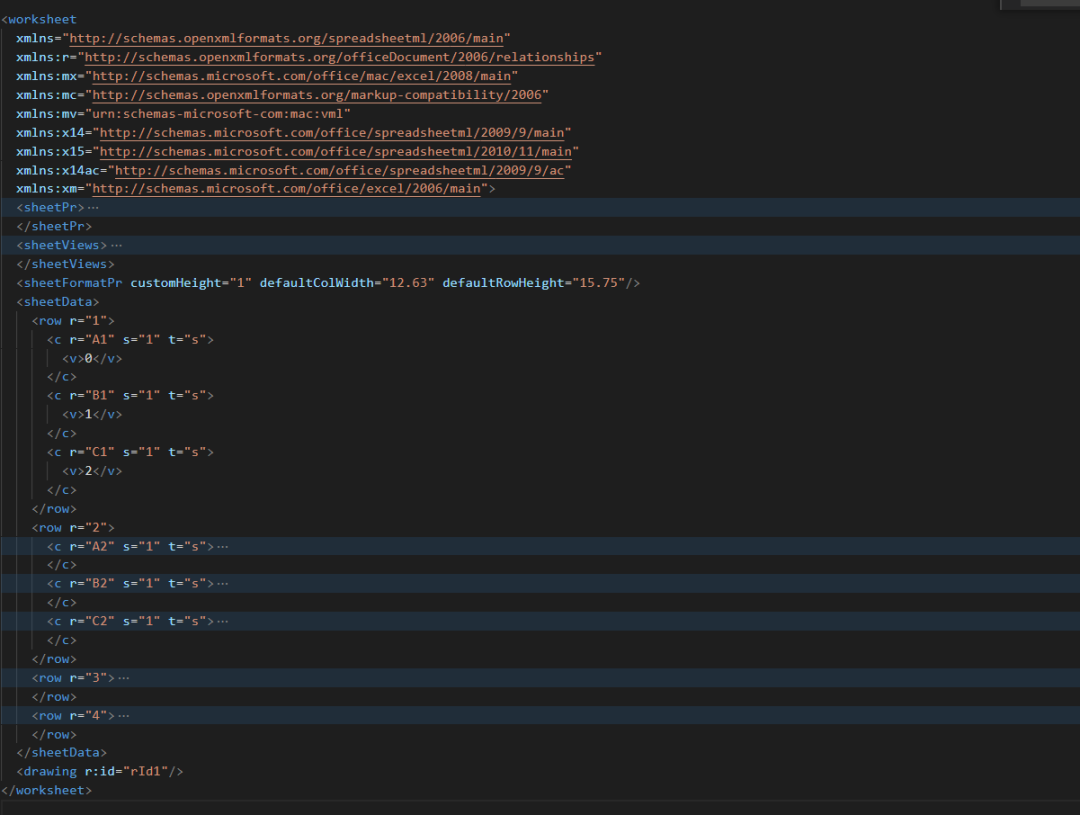 现在我们可以知道,string只保存有值的格子里的值,而sheet则是一个网格,不管格子有没有值都会记录,有值的会有个序号存在v节点中。