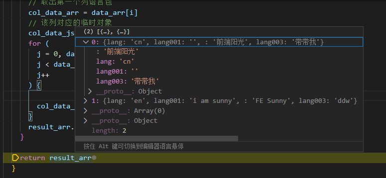 /**** @param {array*2} data* 返回处理完后的多语言数组,每一项都是一个json对象。*/function convertProcess(data) {var keys_arr = [],data_arr = [],result_arr = [],i,j,data_arr_len,col_data_json,col_data_arr,data_arr_col_len// 表格合并处理,这是json属性列。keys_arr = data[0]// 第一例是json描述,后续是语言包data_arr = data.slice(1)for (i = 0, data_arr_len = data_arr.length; i < data_arr_len; i++) {// 取出第一个列语言包col_data_arr = data_arr[i]// 该列对应的临时对象col_data_json = {}for (j = 0, data_arr_col_len = col_data_arr.length;j < data_arr_col_len;j++) {col_data_json[keys_arr[j]] = col_data_arr[j]}result_arr.push(col_data_json)}return result_arr}