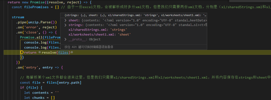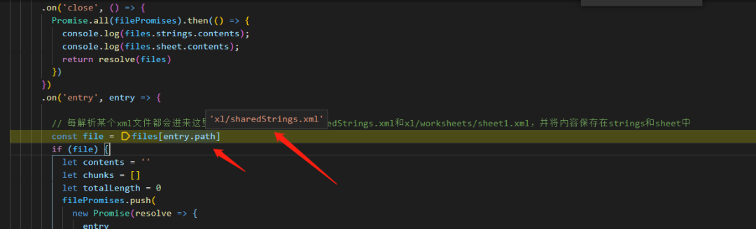 function extractFiles(path) {// excel的本质是多份xml组成的压缩文件,这里我们只需要xl/sharedStrings.xml和xl/worksheets/sheet1.xmlconst files = {strings: {}, // strings内容sheet: {},'xl/sharedStrings.xml': 'strings','xl/worksheets/sheet1.xml': 'sheet'}const stream = path instanceof Stream ? path : fs.createReadStream(path)return new Promise((resolve, reject) => {const filePromises = [] // 由于一份excel文档,会被解析成好多分xml文档,但是我们只需要两份xml文档,分别是(xl/sharedStrings.xml和xl/worksheets/sheet1.xml),所以用数组接受stream.pipe(unzip.Parse()).on('error', reject).on('close', () => {Promise.all(filePromises).then(() => {return resolve(files)})}).on('entry', entry => {// 每解析某个xml文件都会进来这里,但是我们只需要xl/sharedStrings.xml和xl/worksheets/sheet1.xml,并将内容保存在strings和sheet中const file = files[entry.path]if (file) {let contents = ''let chunks = []let totalLength = 0filePromises.push(new Promise(resolve => {entry.on('data', chunk => {chunks.push(chunk)totalLength += chunk.length}).on('end', () => {contents = Buffer.concat(chunks, totalLength).toString()files[file].contents = contentsif (/�/g.test(contents)) {throw TypeError('本次转化出现乱码�')} else {resolve()}})}))} else {entry.autodrain()}})})