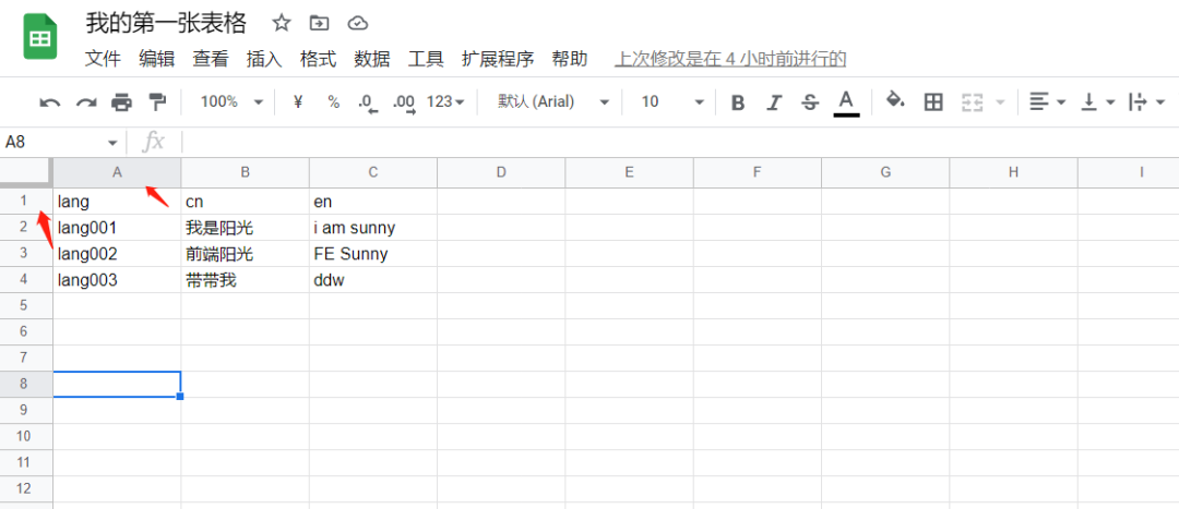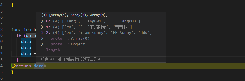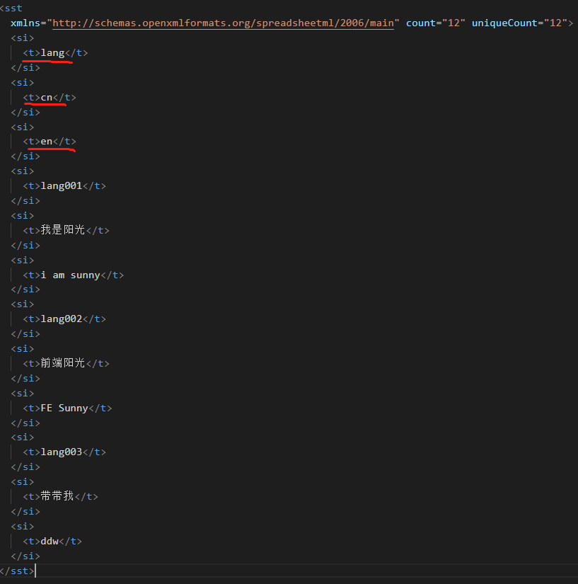 最终生成的values数组是[ 'lang', 'cn','en', 'lang001','我是阳光', 'i am sunny','lang002', '前端阳光','FE Sunny', 'lang003','带带我', 'ddw']