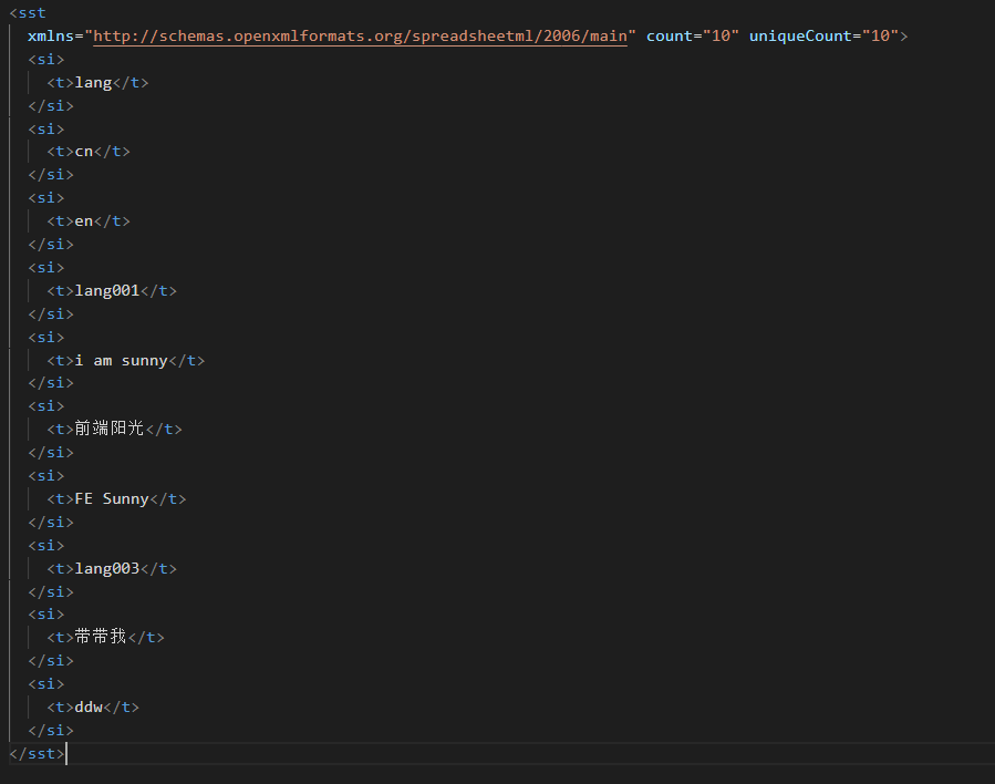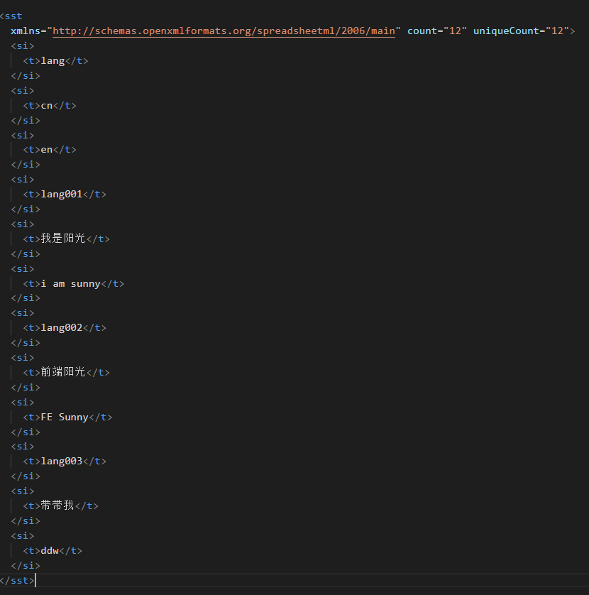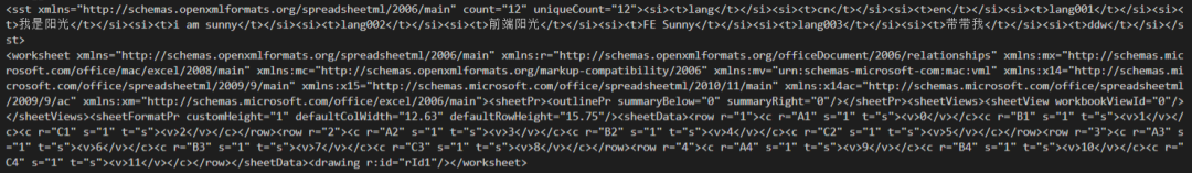 可以看到sheetData节点其实就是记录strings的内容的信息的,strings的内容是我们真正输入的,而sheet则是类似一种批注。
