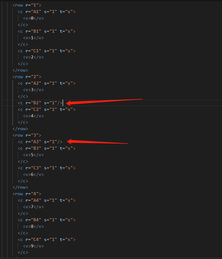 可以看到这打印出来的xml内容,strings中已经没有了那两个值,而sheet中的那两个格子的c节点的t属性没了,而且v节点也没有了。
