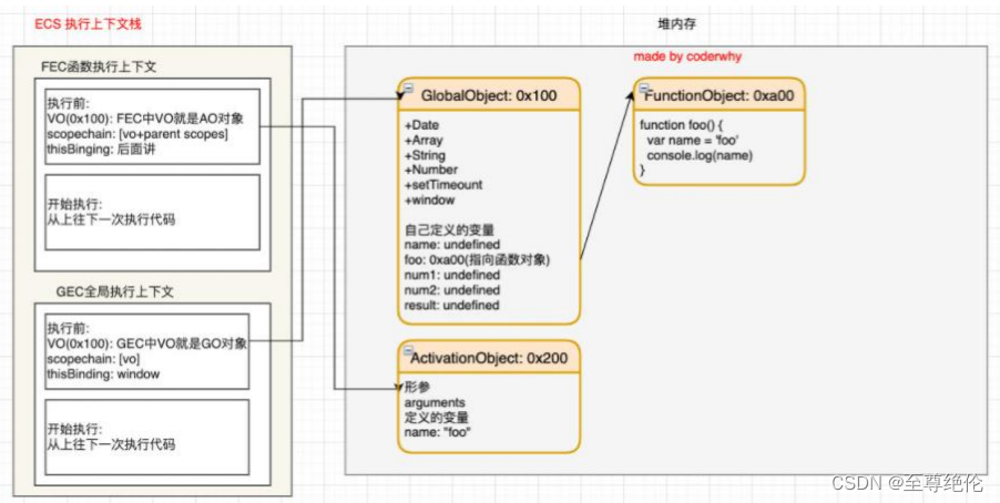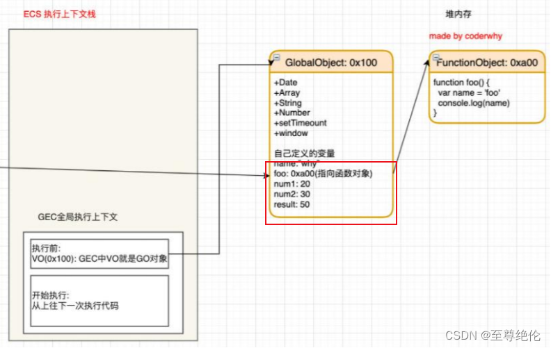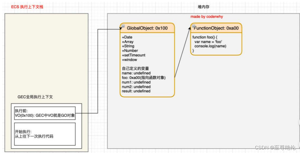 在执行全局代码之前,创建了一个GO对象,里面有一些内置的对象,还有自己定义的变量,自己定义的变量普通类型都为undefined。全局执行上下文GEC中的VO就是GO对象。