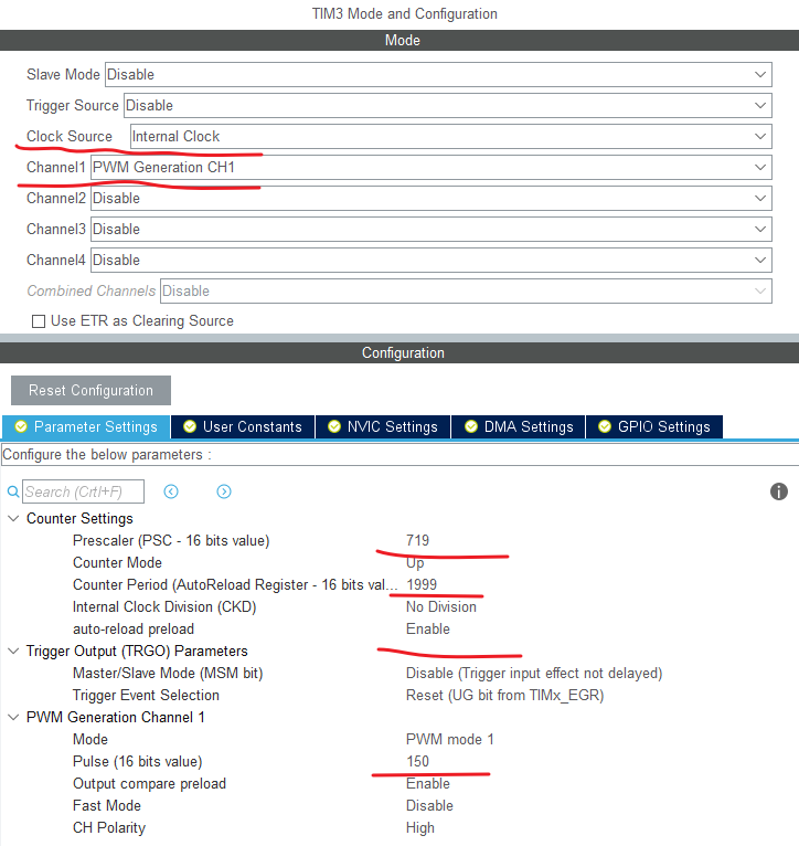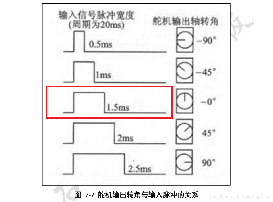 这里,预分频PSC = 720,则定时器每10us计数一次,重装载值为2000,则PWM周期为2000 * 10(us) = 20ms,正好是舵机控制所需要的周期。脉宽为150*10/1000 = 1.5ms,对应初始角度为0的位置。