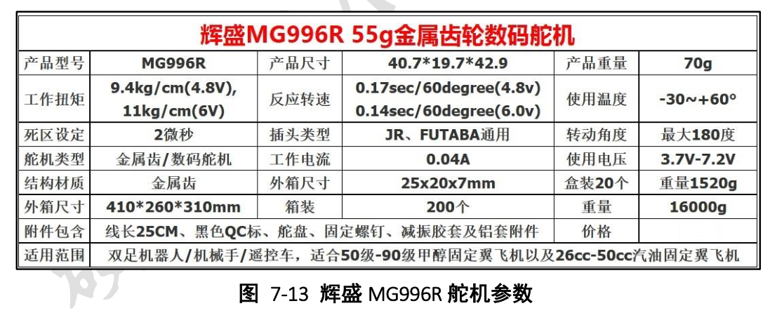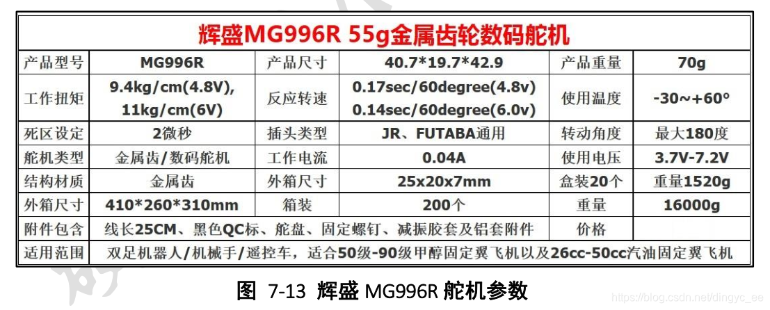 我们使用的舵机型号为 MG996R,由上面的舵机原理可知,只需要生成一个周期为20ms的PWM脉冲,通过调整PWM脉宽就可以对应的改变舵机的角度。以下是舵机参数: