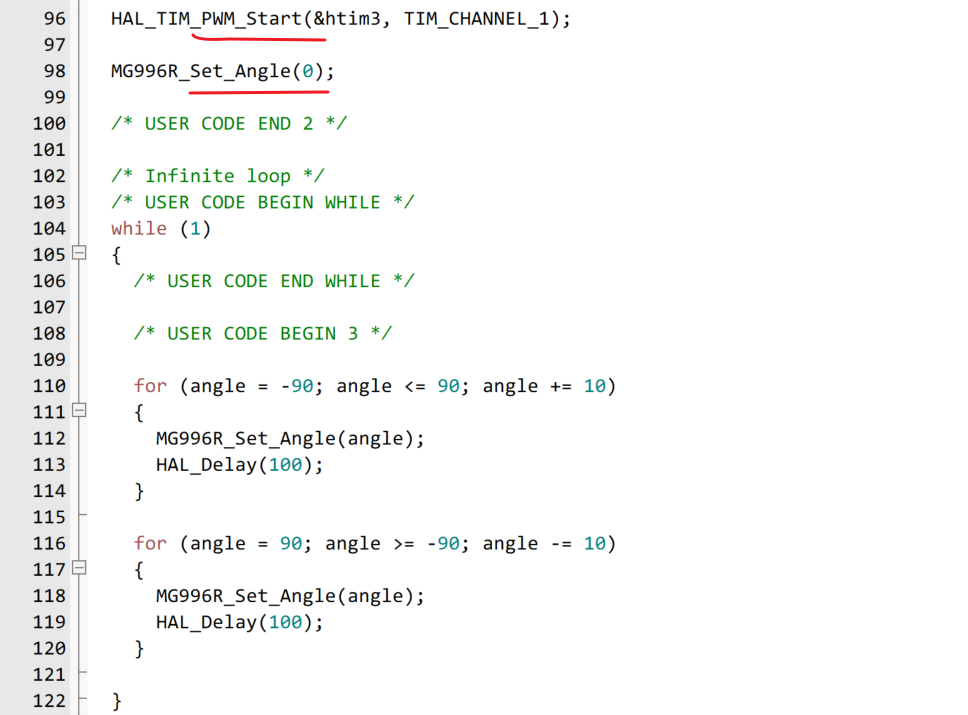 {/* USER CODE BEGIN 1 */int16_t angle = 0;/* USER CODE END 1 *//* MCU Configuration--------------------------------------------------------*//* Reset of all peripherals, Initializes the Flash interface and the Systick. */HAL_Init();/* USER CODE BEGIN Init *//* USER CODE END Init *//* Configure the system clock */SystemClock_Config();/* USER CODE BEGIN SysInit *//* USER CODE END SysInit *//* Initialize all configured peripherals */MX_GPIO_Init();MX_TIM3_Init();/* USER CODE BEGIN 2 */HAL_TIM_PWM_Start(&htim3, TIM_CHANNEL_1);MG996R_Set_Angle(0);/* USER CODE END 2 *//* Infinite loop *//* USER CODE BEGIN WHILE */while (1){/* USER CODE END WHILE *//* USER CODE BEGIN 3 */for (angle = -90; angle <= 90; angle += 10){MG996R_Set_Angle(angle);HAL_Delay(100);}for (angle = 90; angle >= -90; angle -= 10){MG996R_Set_Angle(angle);HAL_Delay(100);}}/* USER CODE END 3 */