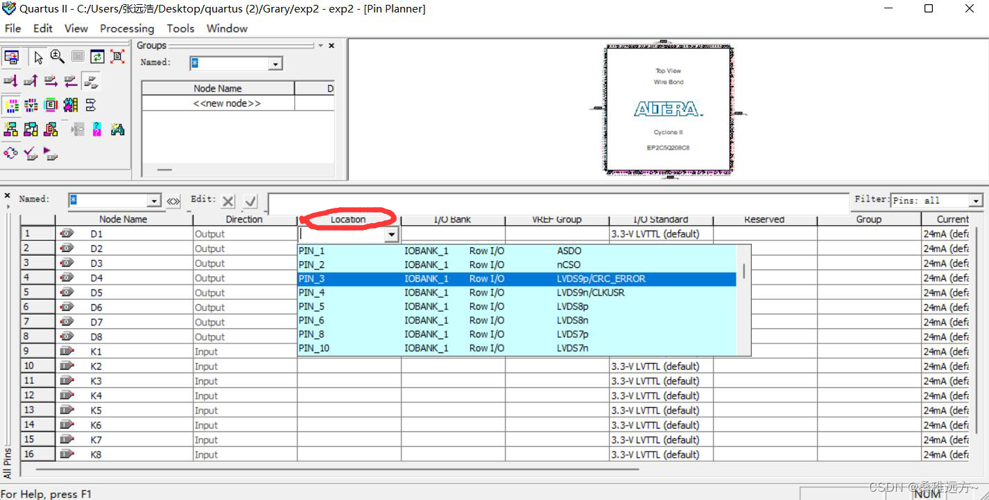 2.编辑管脚,点击下面的location,分别为输入输出端管脚设置配置,只设置location,完成之后关闭即可,自动保存,推荐使用第三步中的导入功能,前提你已经做好了管脚文件