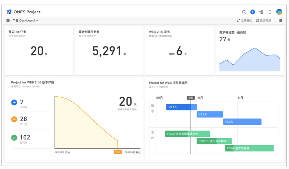 △ ONES Project 项目仪表盘,便于团队监控项目