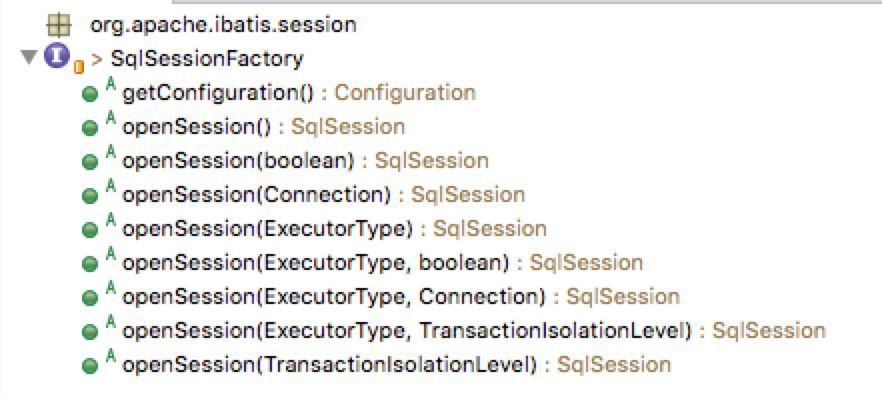 可以看到,该Factory的openSession方法重载了很多个,分别支持autoCommit、Executor、Transaction等参数的输入,来构建核心的SqlSession对象。