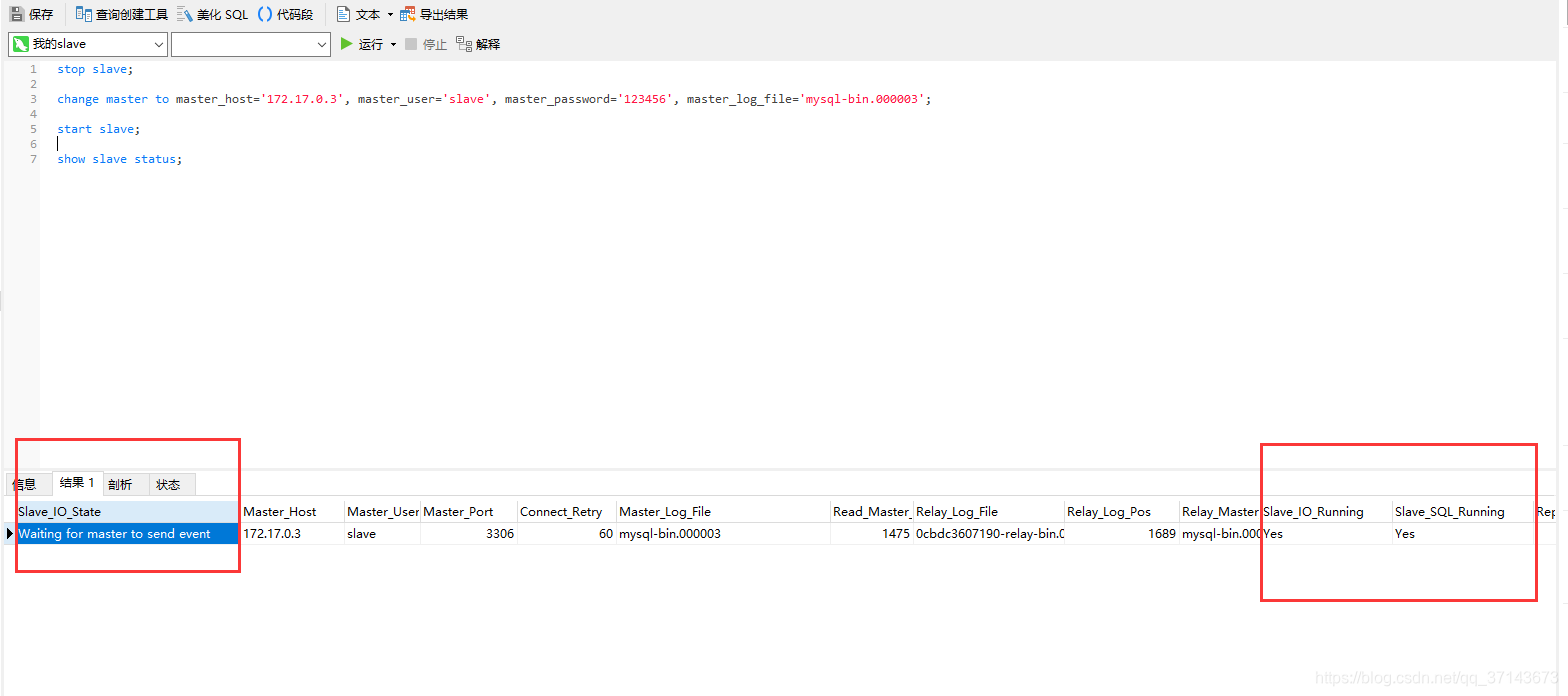change master to master_host='172.17.0.3', master_user='slave', master_password='123456', master_log_file='mysql-bin.000003';-- 启动主从连接