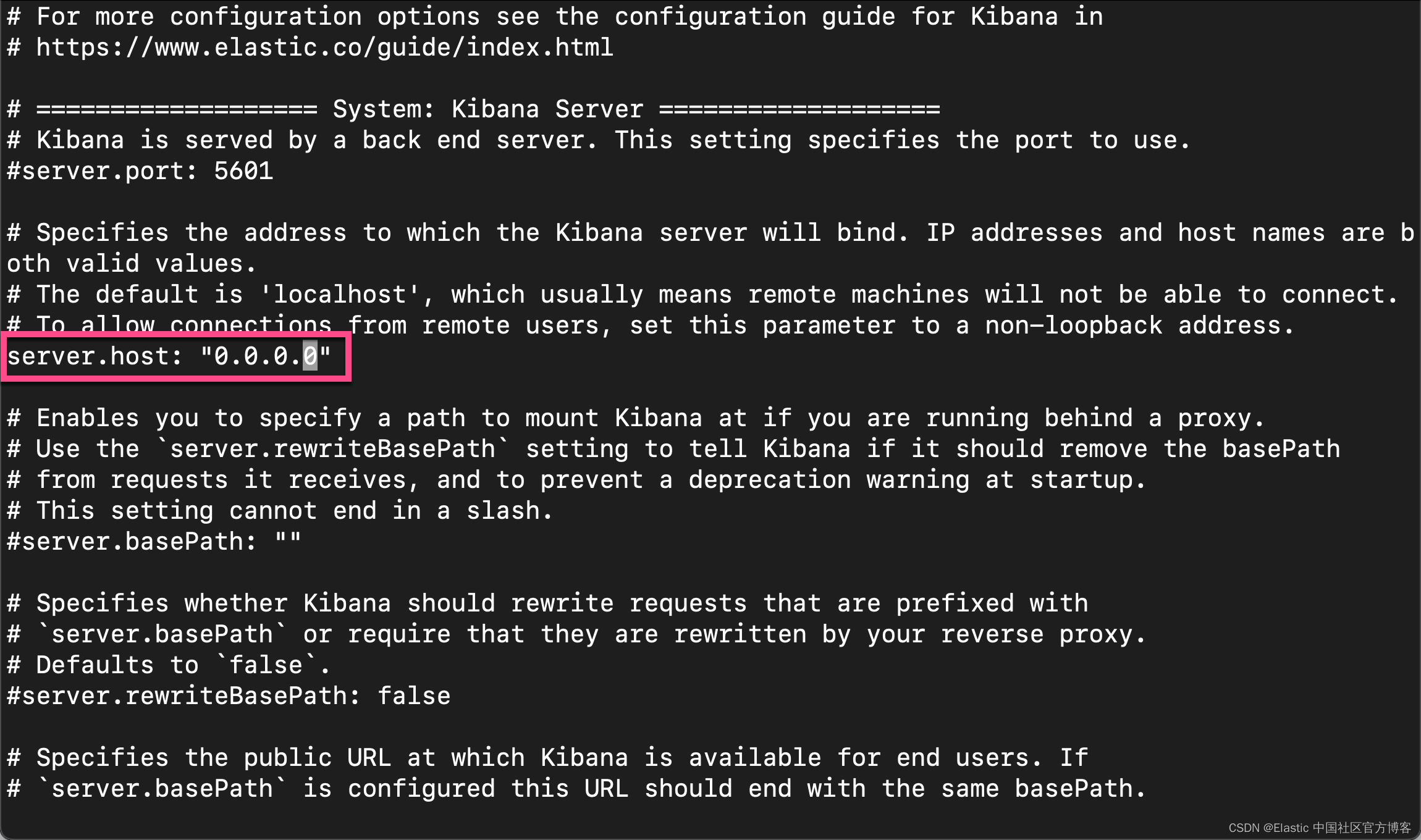 为了能够在 macOS 上能够访问运行于 Ubuntu 上的 Kibana,我们可以针对 config/kibana.yml 做如下的修改: