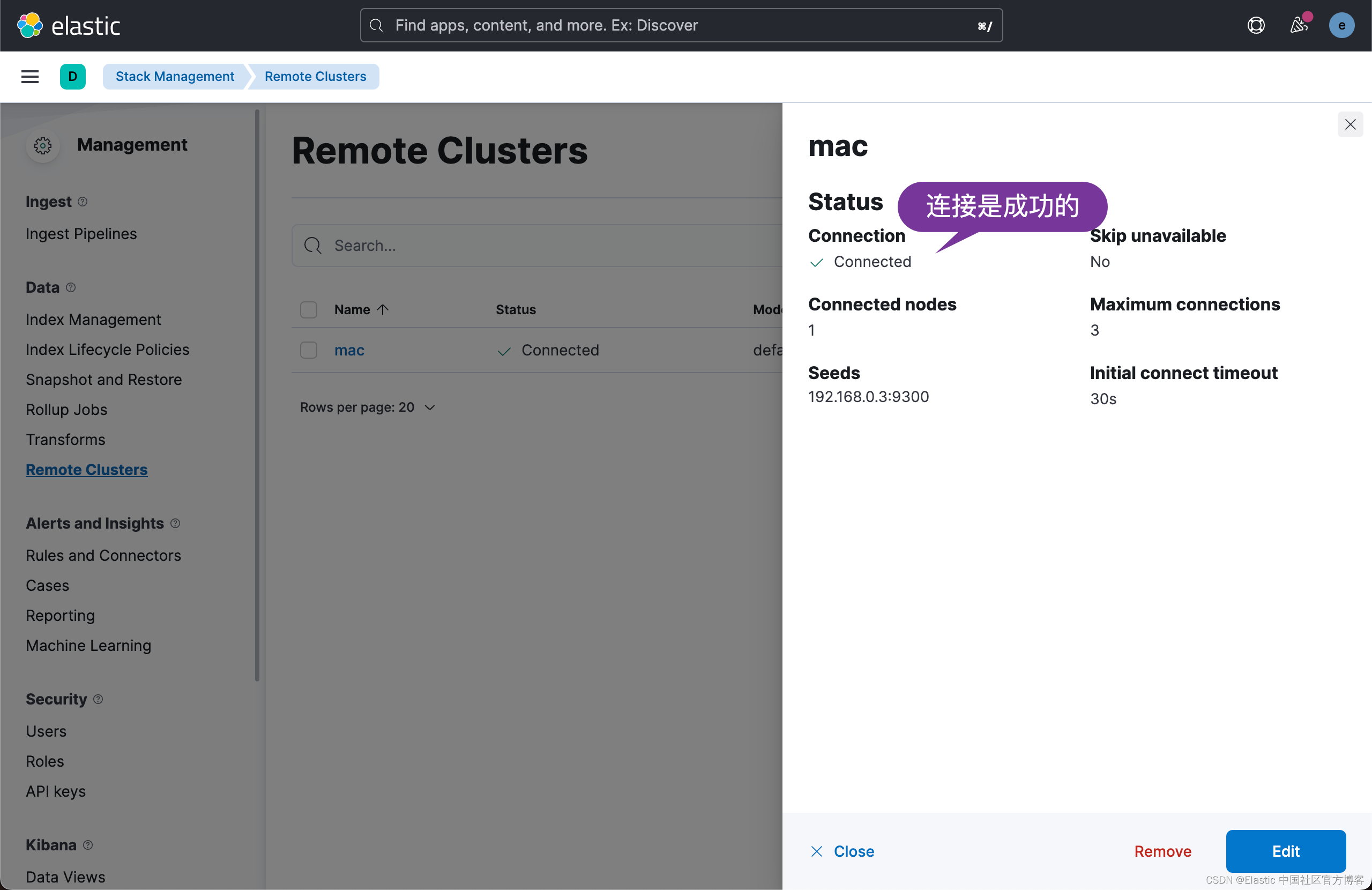 上面显示我们的连接是成功的。当然,我们也可以在 Ubuntu 机器安装的 Elasticsearch 来连接 macOS 上的安装,它也应该是成功的: