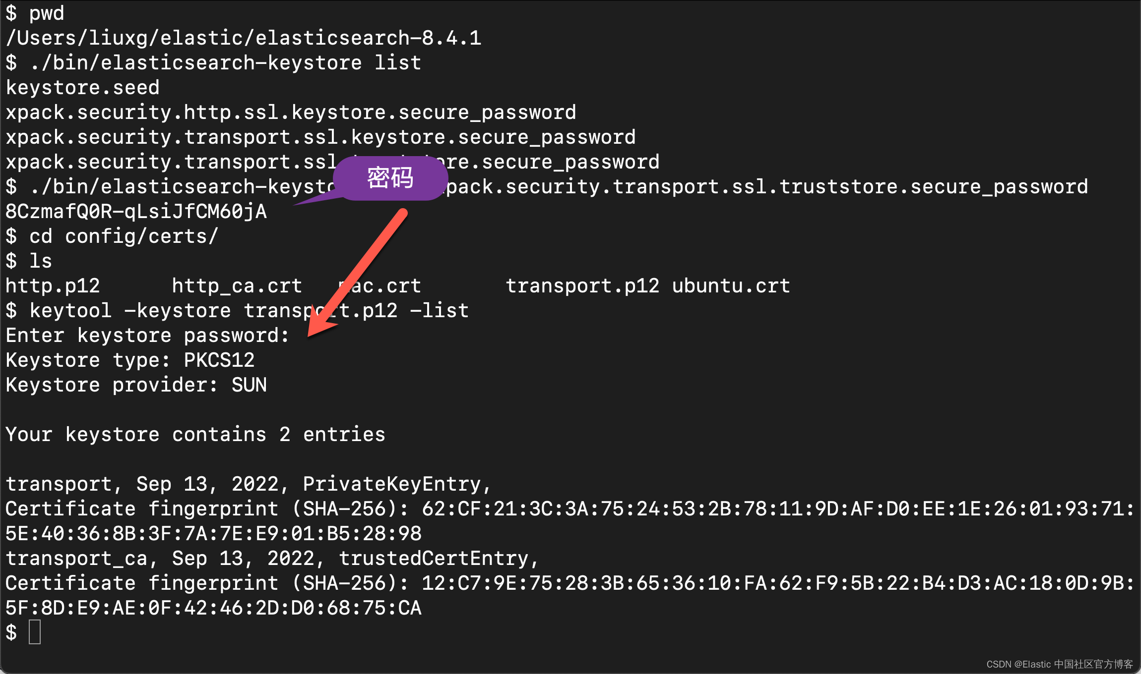 从上面的输出中,我们已经成功地把 mac.crt 这个证书添加到 Ubuntu 下的 Elasticsearch 安装文件 transport.p12 这个 truststore 中去了。