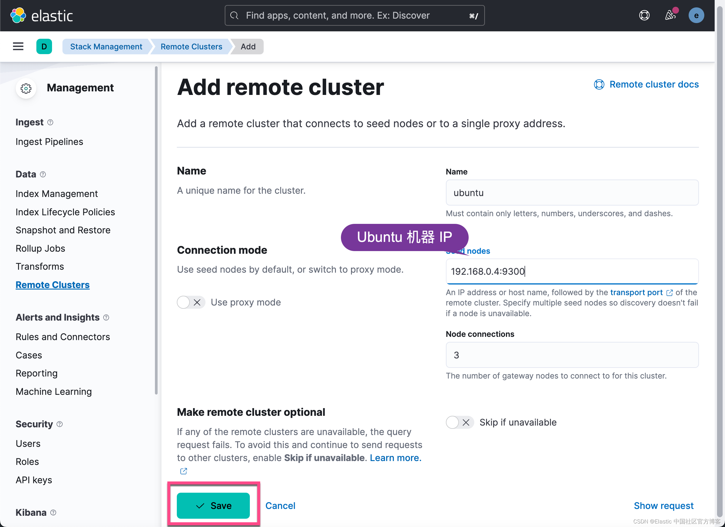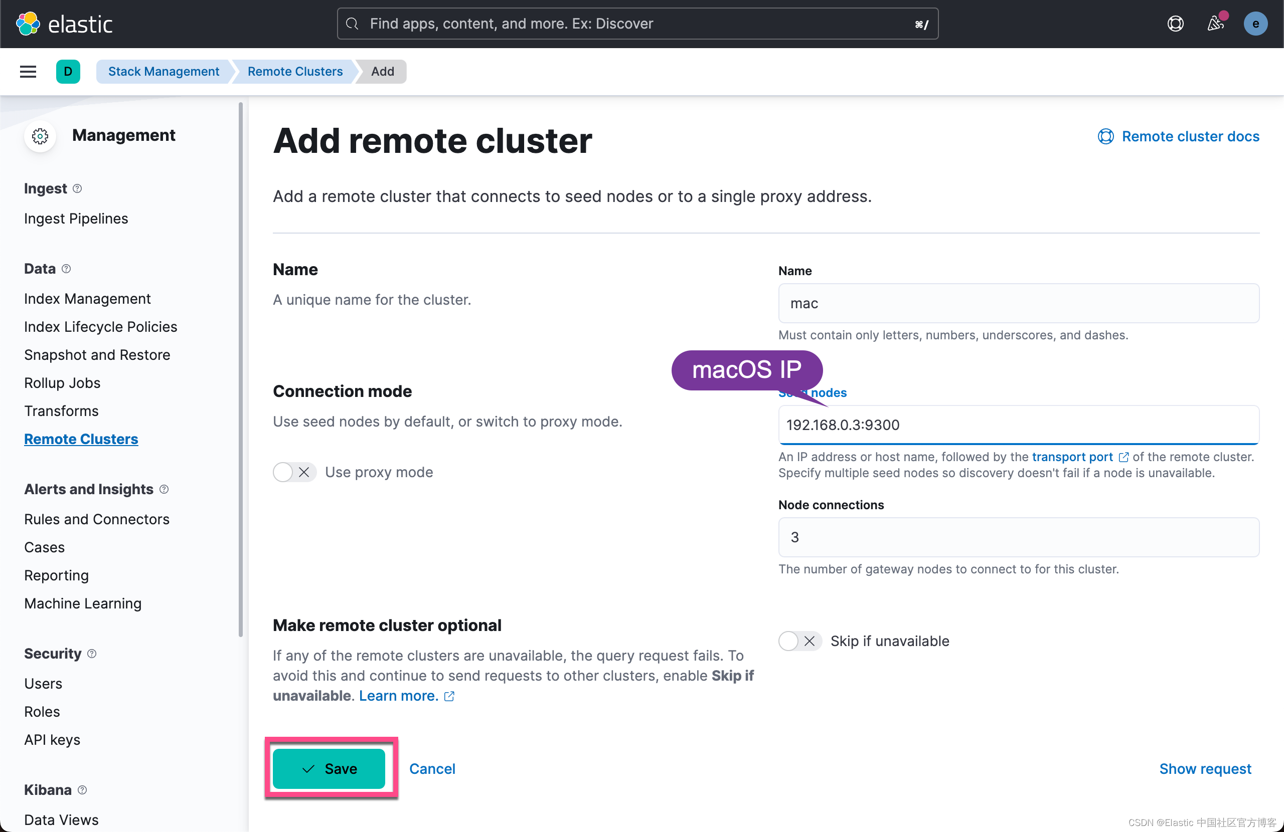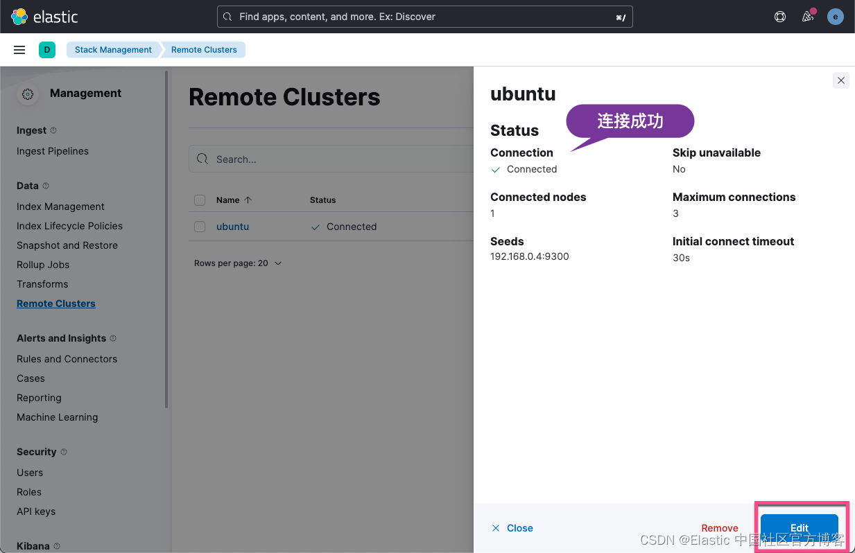我们重新启动 macOS 及 Ubuntu 上的两个 Elasticsearch 集群。我们接着在 macOS 安装的 Kibana 中进行如下的操作: