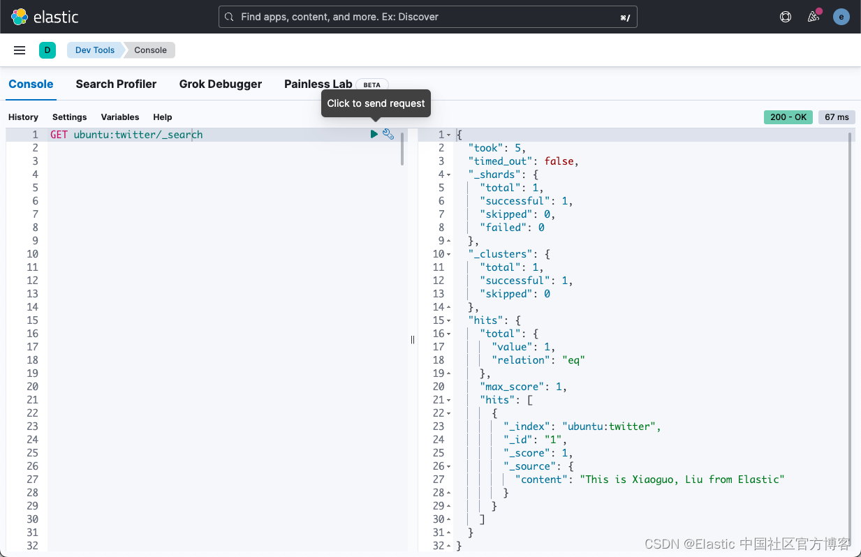 我们接下来在 macOS 里的 Kibana 中打入如下的命令来对 Ubuntu OS 中的 twitter 索引进行搜索: