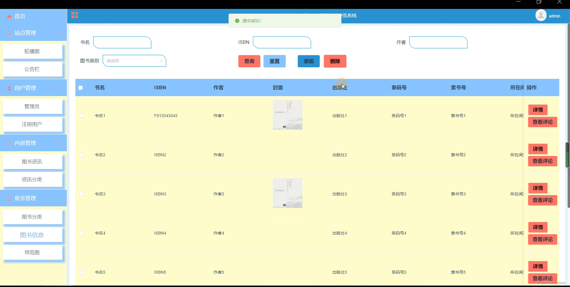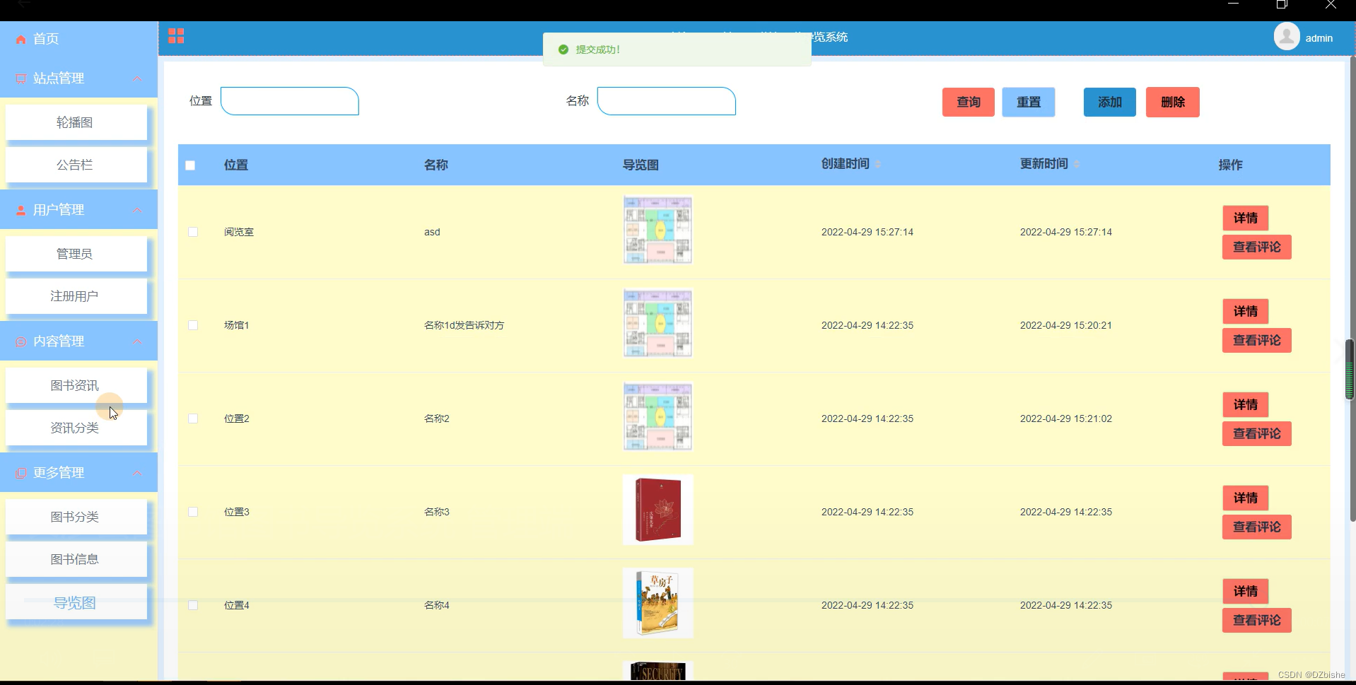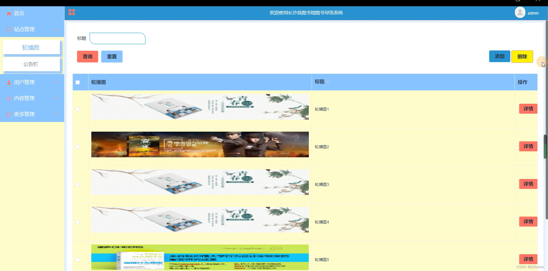 在管理员功能页面可以查看,首页、站点管理(轮播图、公告栏)用户管理(管理员、注册用户)内容管理(图书资讯、资讯分类)更多管理(图书分类、图书信息、导览图)等内容进行相对应操作,如图5-7所示。