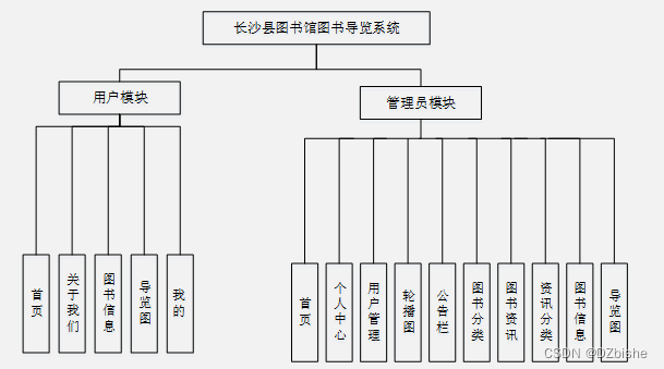 基于微信小程序的图书馆图书导览系统基于现有的手机,可以实现管理员,首页、站点管理(轮播图、公告栏)用户管理(管理员、注册用户)内容管理(图书资讯、资讯分类)更多管理(图书分类、图书信息、导览图)等详细的了解及统计分析。实现用户:首页、关于我们、我的(个人信息、收藏、图书信息、导览图)等详细的了解及统计分析,根据系统功能需求建立的模块关系图如下图: