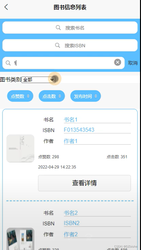 图书信息页面可以查看展示的图书信息详情等信息,并可通过关键词搜索图书,并对资讯点赞、评论、收藏等操作。如图5-4所示。