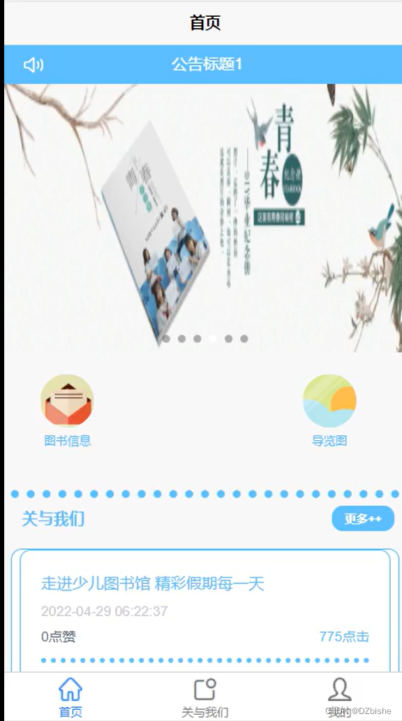 首页,可以进行首页、关于我们、我的(个人信息、收藏、图书信息、导览图)等功能模块的查看与操作,如图5-3所示。