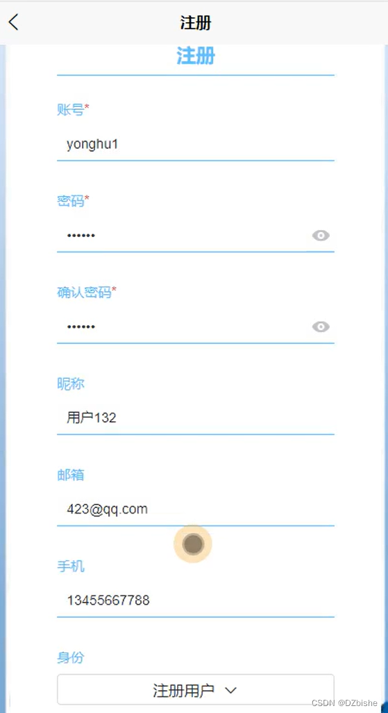 注册,通过填写账号、密码、昵称、手机、、邮箱、简介等信息,输入完成后选择提交即可注册成功,如图5-2所示。