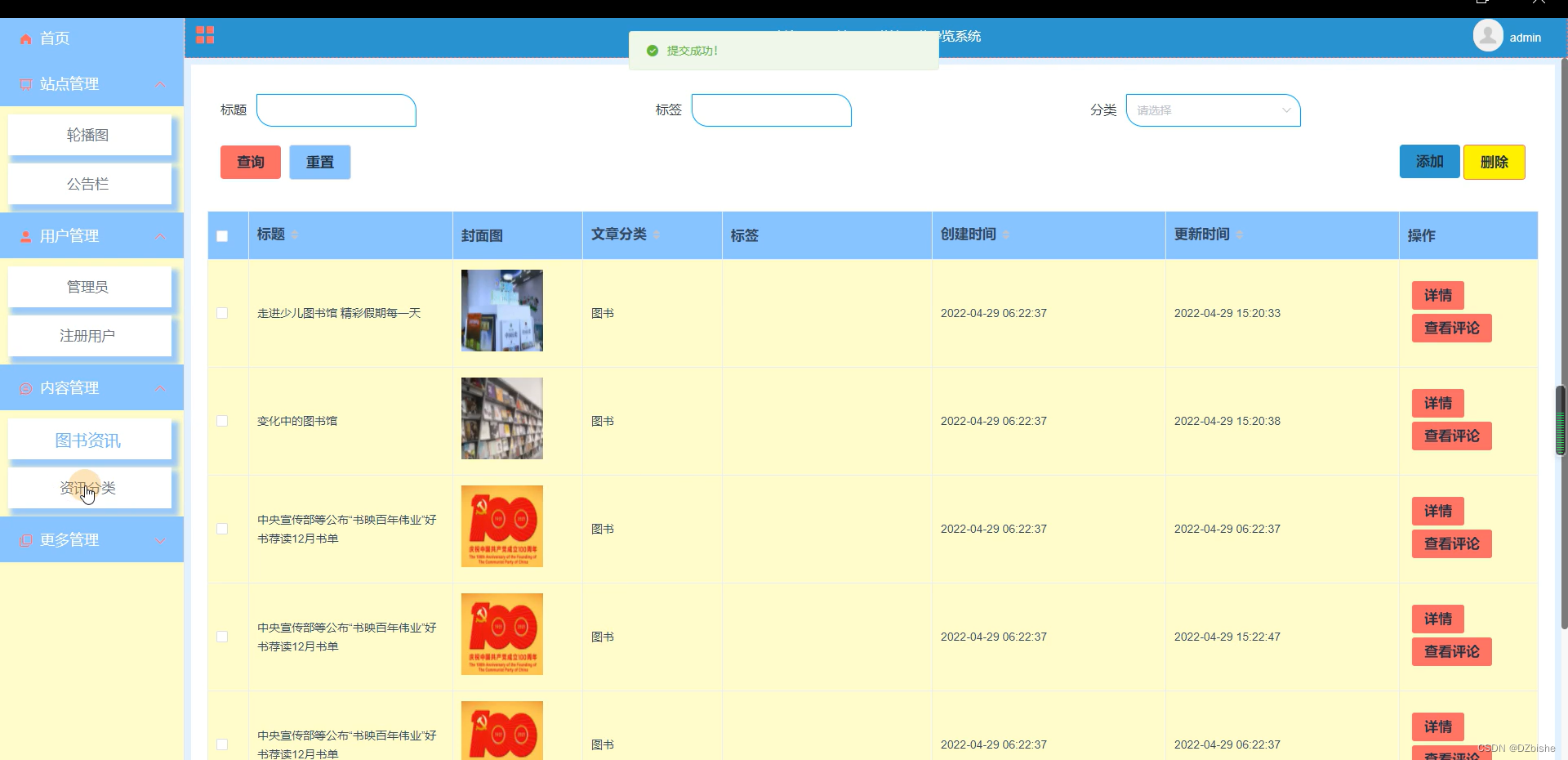 图书资讯管理,在图书资讯页面可以查看标题、封面图、文章分类、标签等内容,并可根据需要进行修改或删除操作,如图5-10所示。