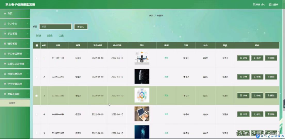 收集表管理,在收集表页面可以对索引,编号,标题,发布时间,截止日期,图片,视频,学号,姓名,班级等内容进行详情,修改和删除等操作,如图5-9所示。